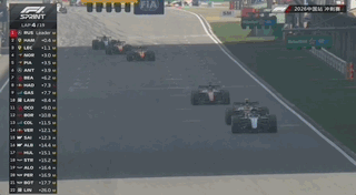 但领跑的拉塞尔将差距越拉越大,甩开了第二名的乐扣超过3秒以上。而起步糟糕的安东内利也已经悄悄上到了第四(但安东内利之前因与哈贾尔之间发生的事故,被赛会罚时10秒),原本两台法拉利夹击梅奔的戏码彻底反转。